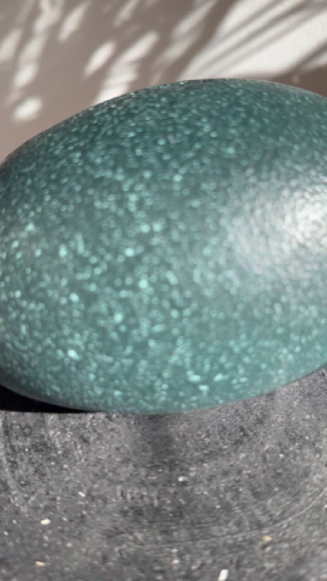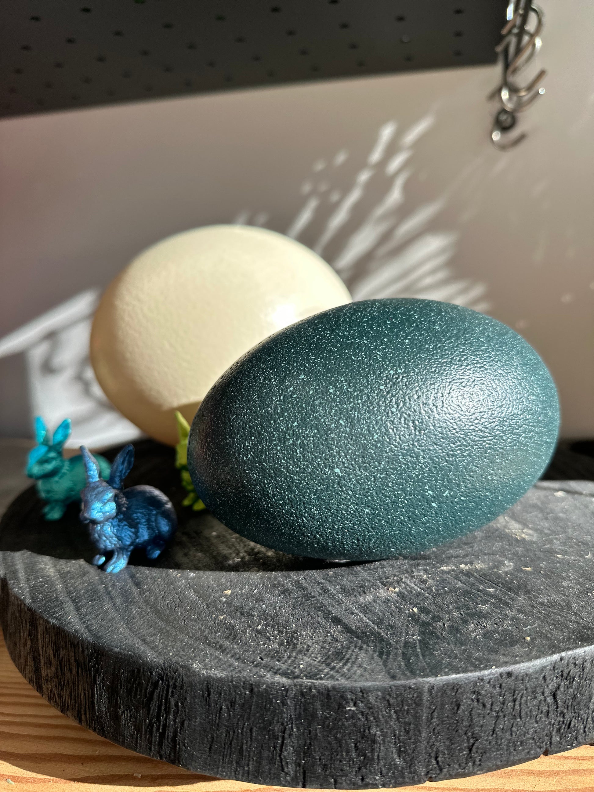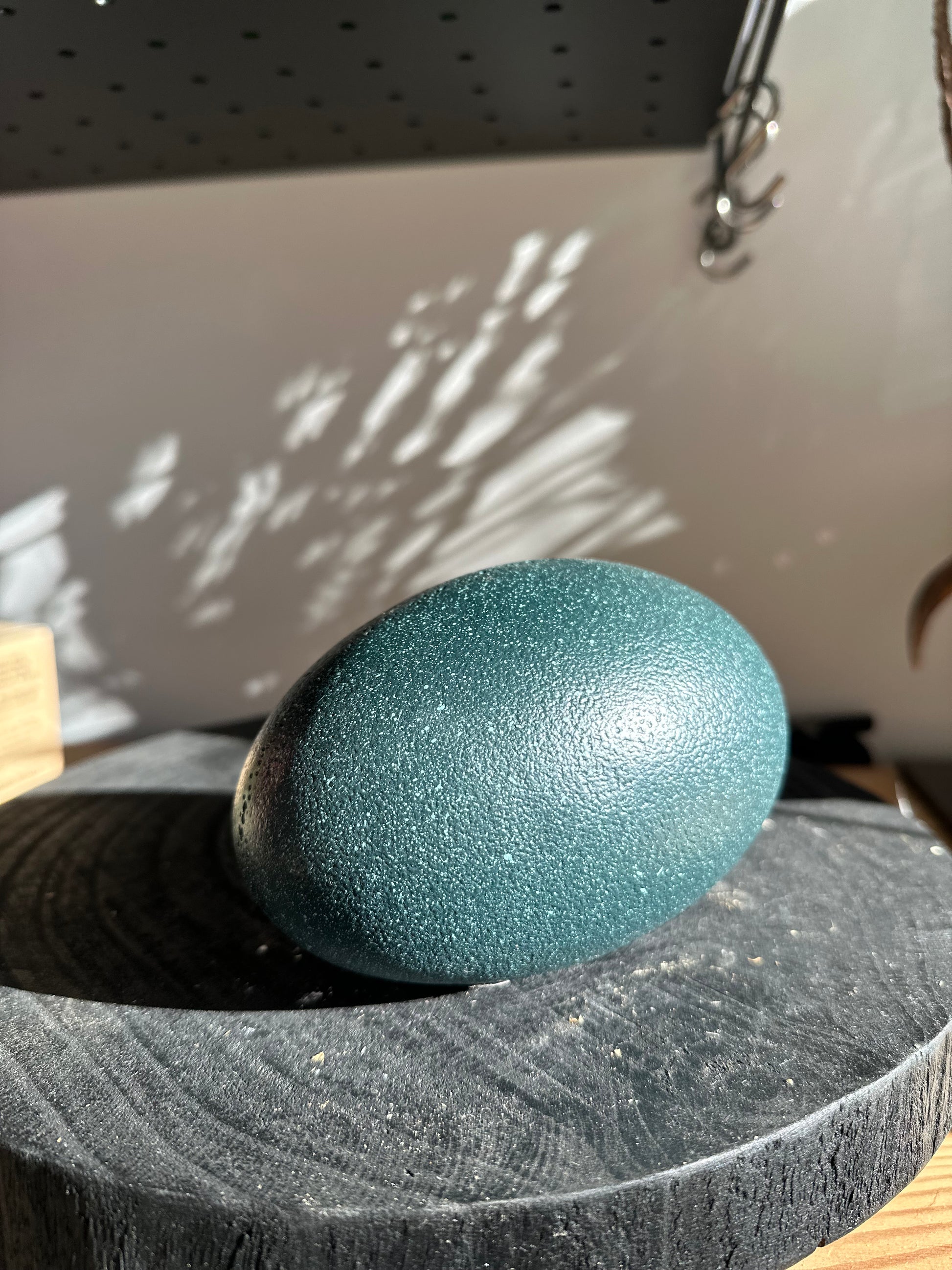 Eine solche Schönheit kann sich nur die Natur ausdenken! Das Emu Ei ist in der Grundfarbe Petrol mit leichten hellblau/grünen Sprenkel! Wir waren sofort Schockverliebt als wir es das erste Mal in den Händen hielten. Es ist ein bisschen grösser als ein Gänseei, aber kleiner als das vom Strauss. Verzaubert aber seinen Betrachter am allermeisten!