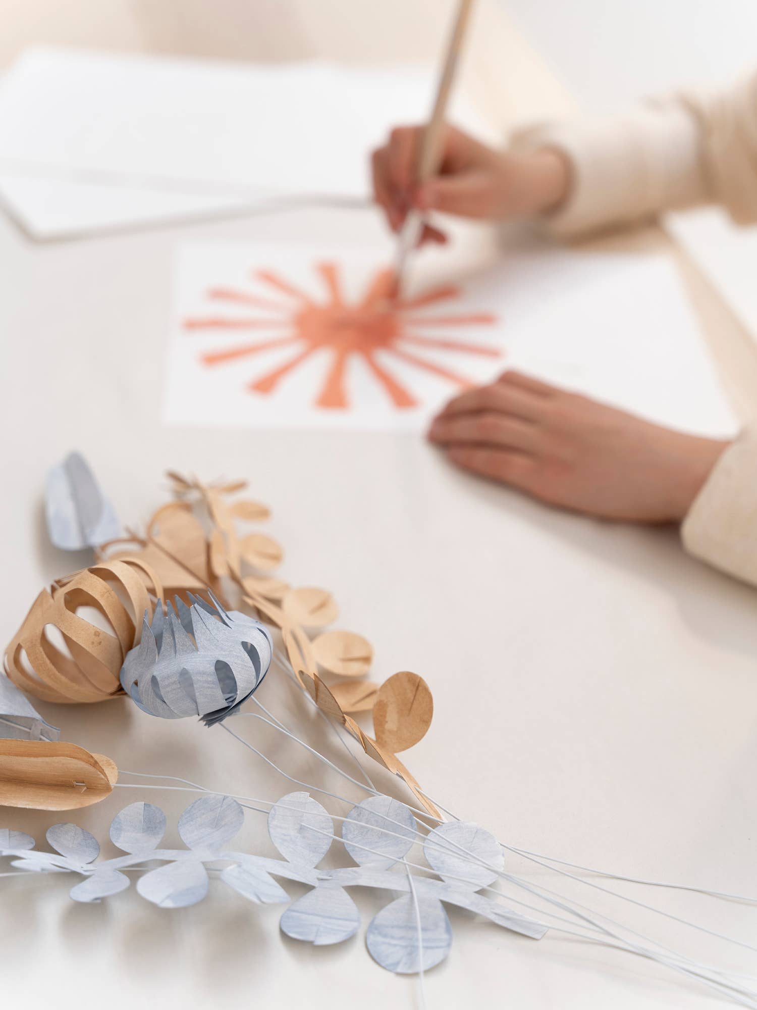 Diese weißen Papierblumen sind perfekt für einen ruhigen Raum mit hellen Erdtönen. Oder warum stellen Sie sie nicht in einer Vase an einer farbigen Wand auf, treten Sie dann einen Schritt zurück und bewundern Sie die Ergebnisse! FIELD white eignet sich auch gut als Kranz. Ihr kleines DIY-Projekt wird in Ihrem Wohnzimmer oder als einzigartige Dekoration für Ihren Hochzeitsort ein minimalistisches Statement setzen. Kein Schneiden oder Kleben notwendig. Alles wird vorgeschnitten und zerknittert geliefert, auch die Blütenstiele sind im Lieferumfang enthalten.