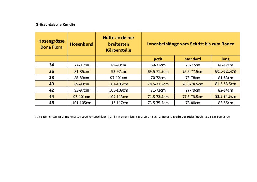 Wir produzieren unsere Gartenhose in den Grössen 36-44, in den Längen: Standard, Petit und Long.
