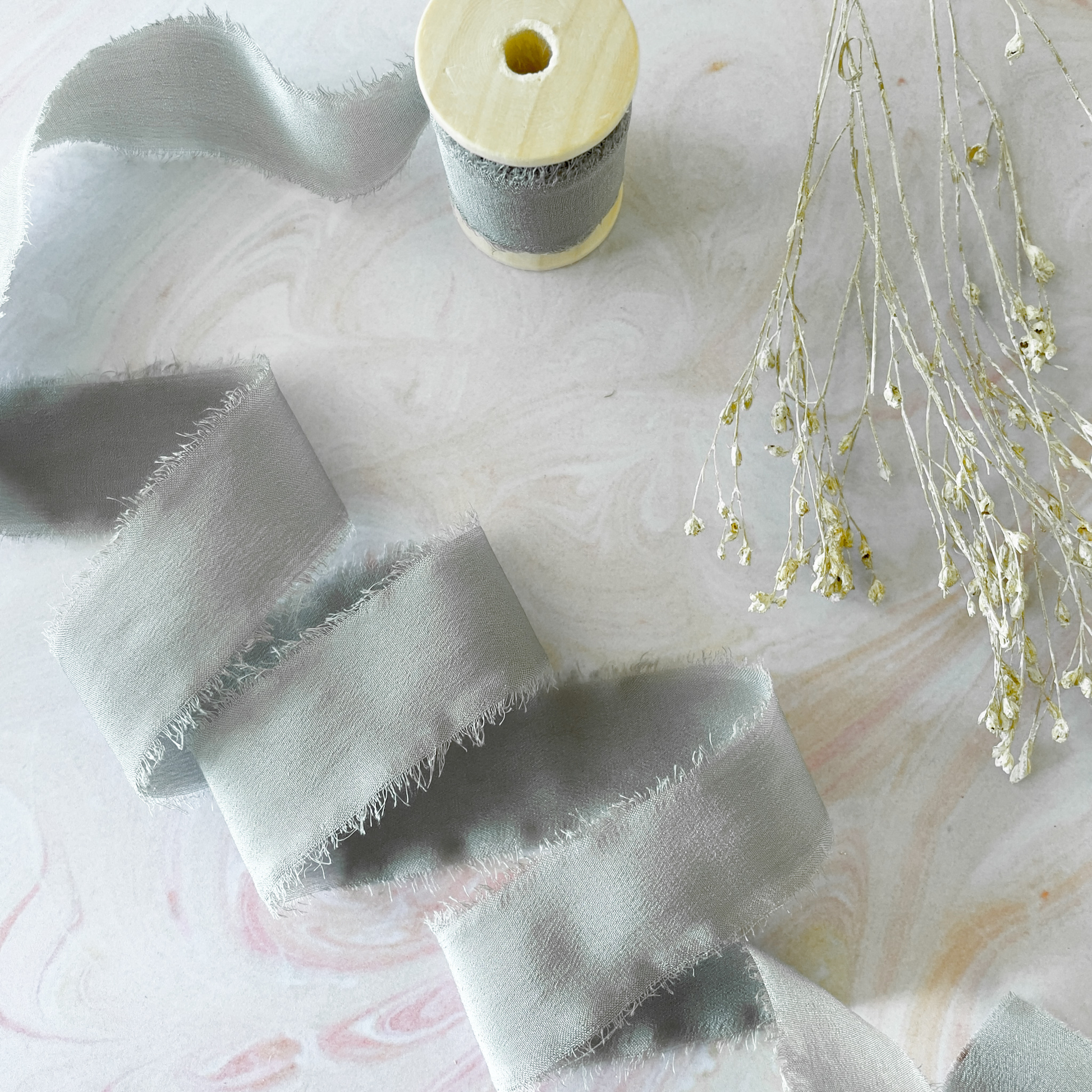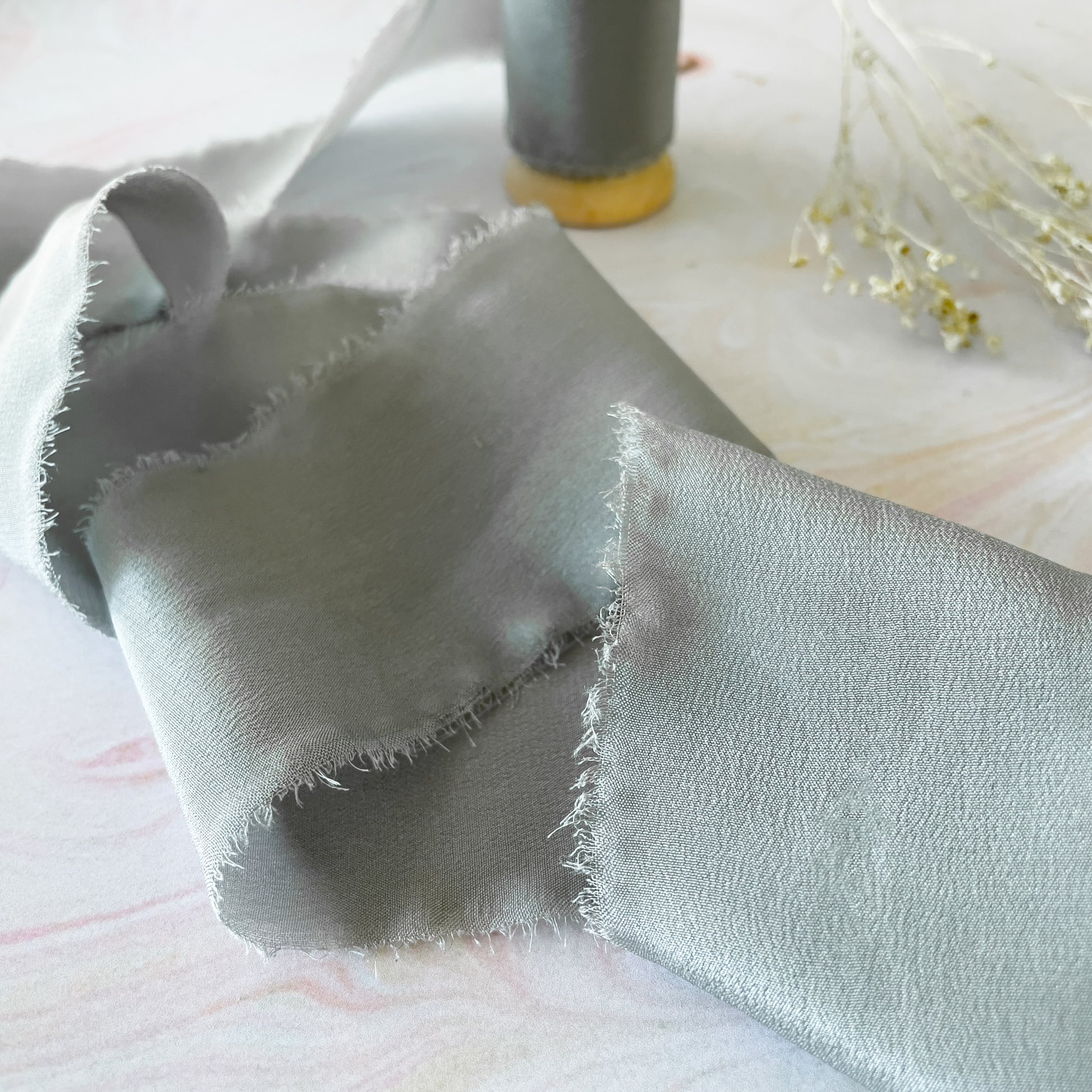 Wunderschönes graues Seidenband mit roher Kante. Perfekt präsentiert auf einer Holzspule. Hergestellt aus 100% Habotai-Seide. Eine hochwertige Seide mit einer offenen Kantenoberfläche. Perfekt, um Ihren Designs Textur und Stil zu verleihen.