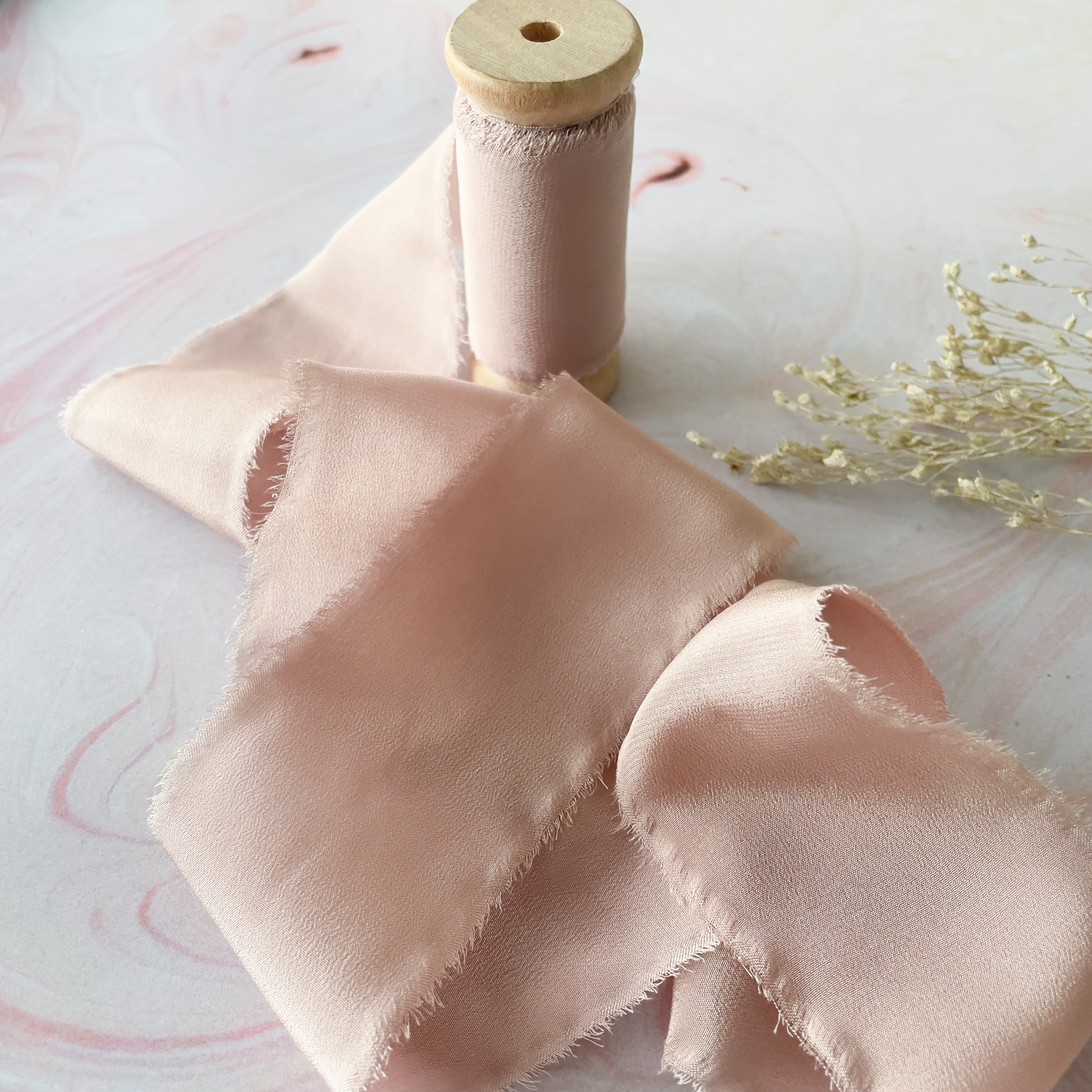 Wunderschönes nudefarbenes Seidenband mit offenem Rand. Perfekt präsentiert auf einer Holzspule. Hergestellt aus 100% Habotai-Seide. Eine hochwertige Seide mit einer offenen Kantenoberfläche. Perfekt, um Ihren Designs Textur und Stil zu verleihen.