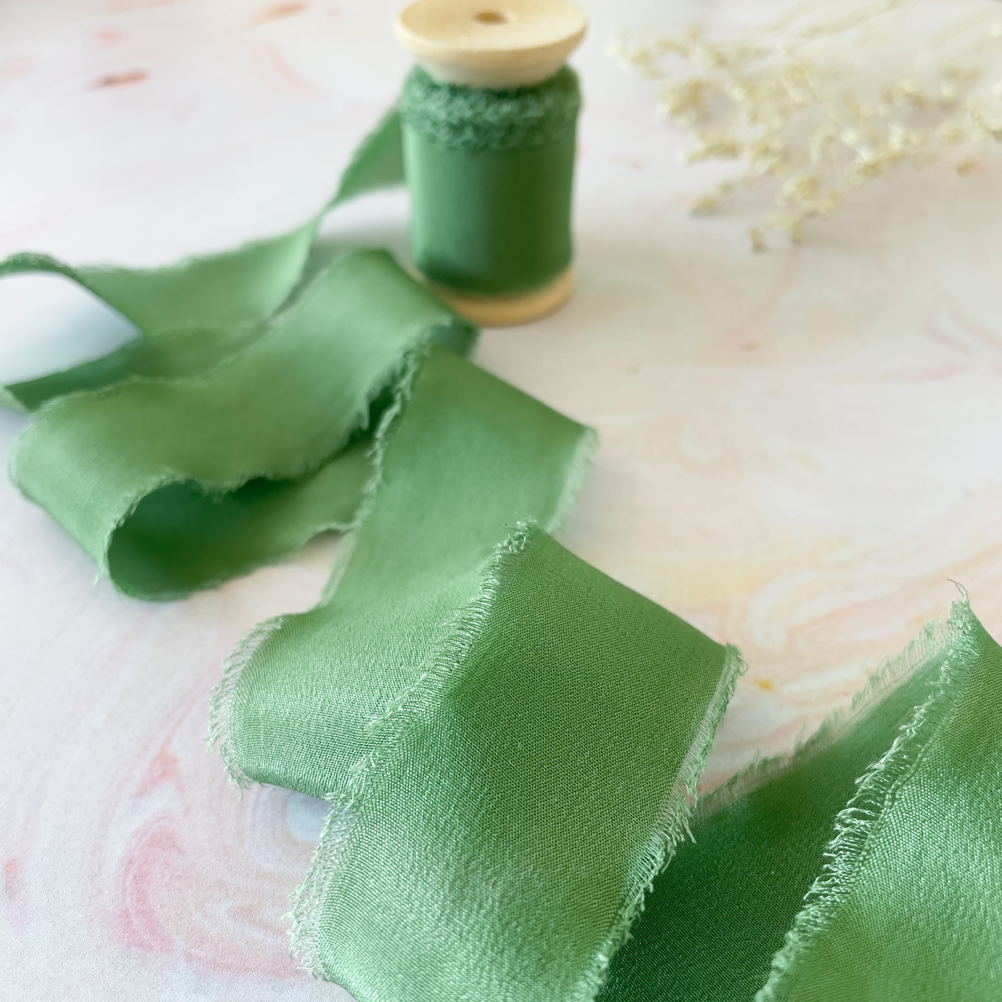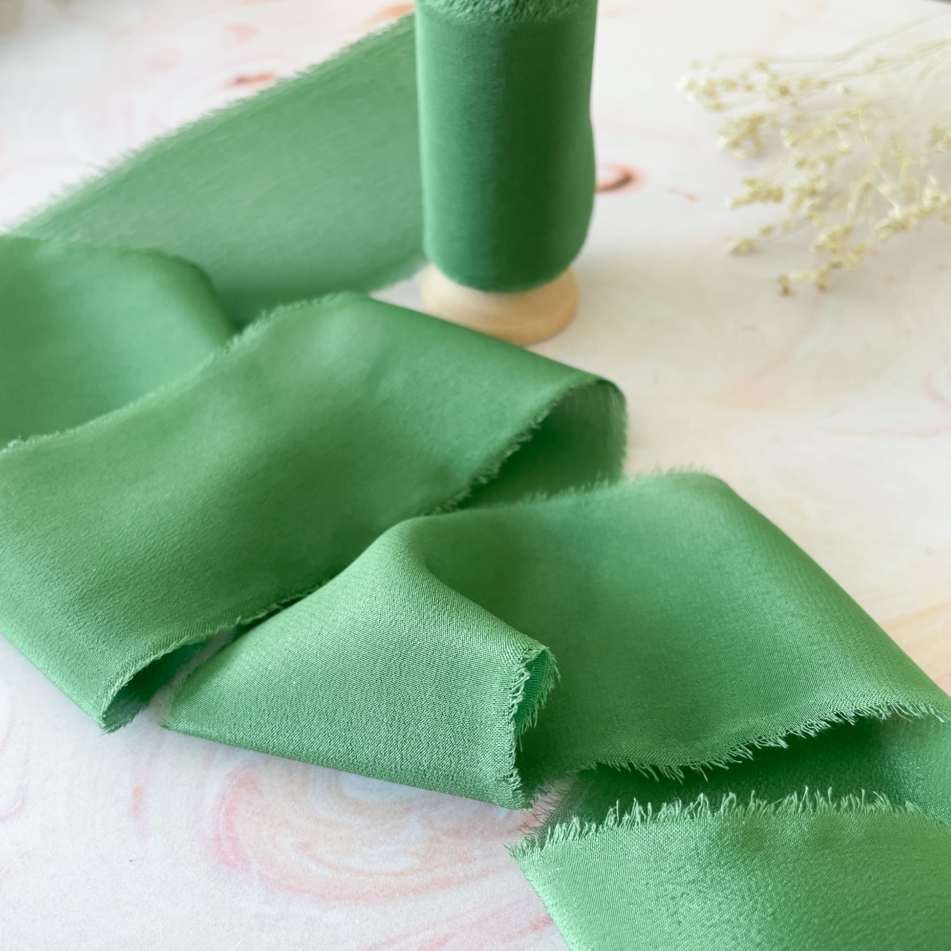 Wunderschönes smaragdgrünes Seidenband mit roher Kante. Perfekt präsentiert auf einer Holzspule. Hergestellt aus 100% Habotai-Seide. Eine hochwertige Seide mit einer offenen Kantenoberfläche. Perfekt, um Ihren Designs Textur und Stil zu verleihen.