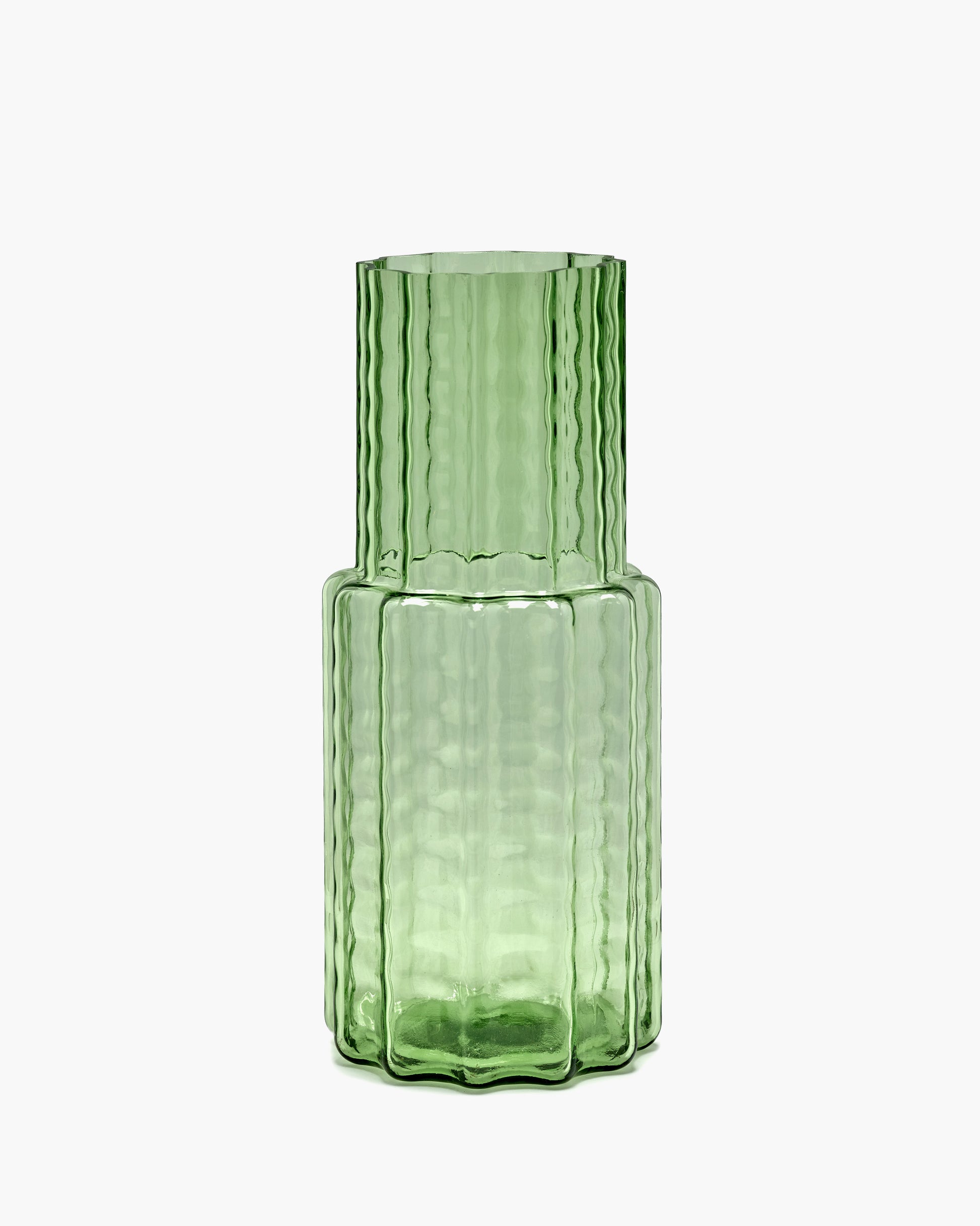 Die klare Formensprache und die feine Struktur der Vase werden durch eine subtile Farbwahl unterstrichen – ein sehr helles, fast transparentes Grün. Diese Nuance lenkt die Aufmerksamkeit bewusst auf die Materialität und macht Wave zu einem puristischen Highlight.
